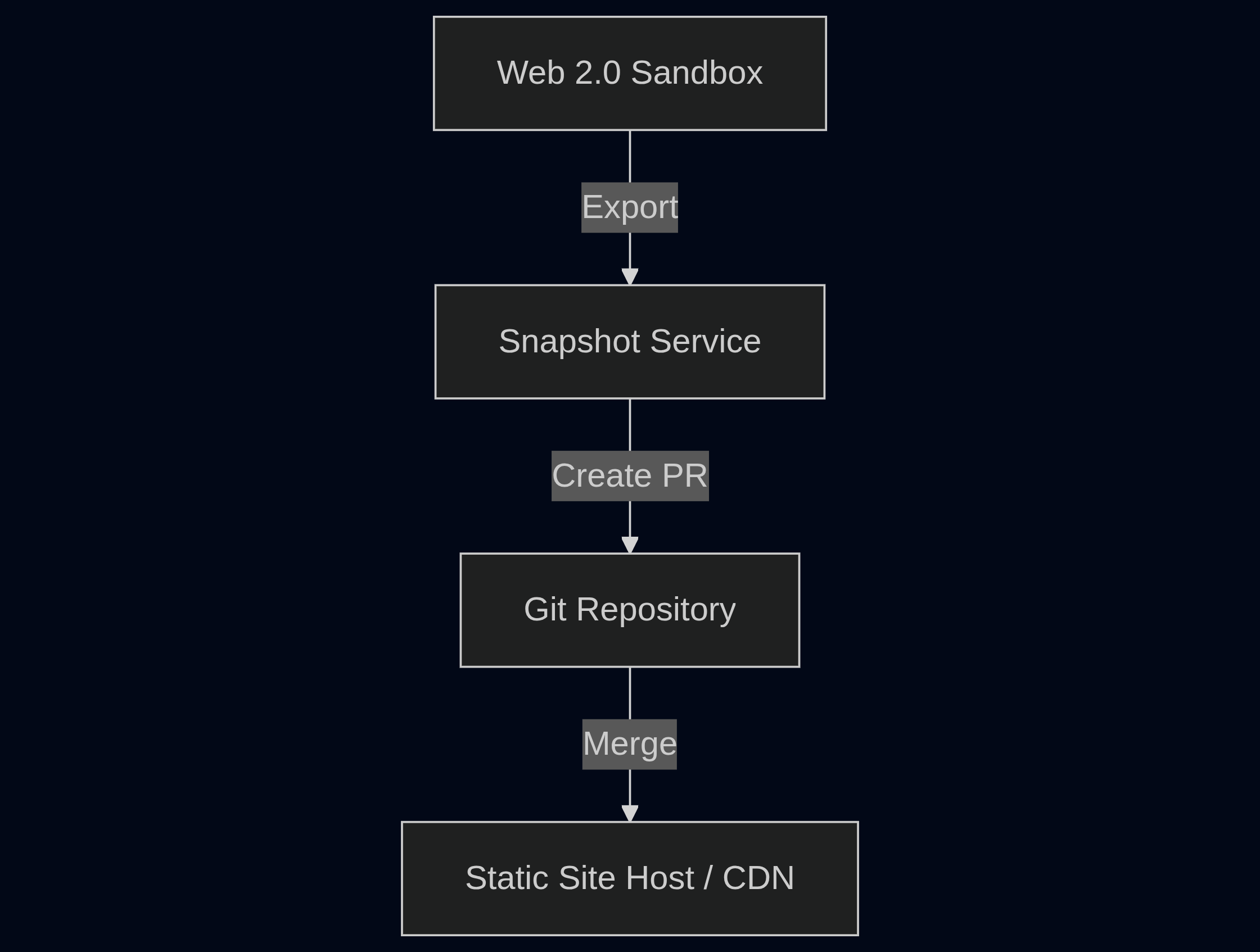 This service runs periodically; I chose once a day. It exports the sandbox and checks any changes into a git repository and creates a pull request. I wrote a simple shell script that is run by a systemd service running on a system without a public IP. This could be done with your favorite programming language on your favorite serverless action function platform framework.
